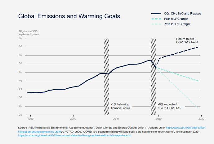 No vaccine for environmental degradation. Last year, for the first time in 15 years of the Global Risks Perception Survey (GRPS), the five most likely long-term risks were environmental— analyzed in last year’s Global Risks Report chapters. The WEF COVID-19 Risks Outlook, published in May 2020, analyzed how the crisis could stall progress on climate action. This year, GRPS respondents ranked environmental risks as four of the top five by likelihood—“infectious diseases” is fourth. Global CO2 emissions fell by 9% in the first half of 2020, when COVID-19 forced most economies to shut down for weeks. A similar decrease is required every year for the next decade to maintain progress towards limiting global warming to 1.5°C (see Figure below) and avoid the worst effects of climate change. Collective efforts are needed to prevent a repeat as economies emerge from the pandemic. Growth and emissions must be decoupled and transition risks managed in an urgent evolution to a low-carbon economy. At present, only four of the world’s largest economies have assembled recovery packages that will produce a net environmental benefit.