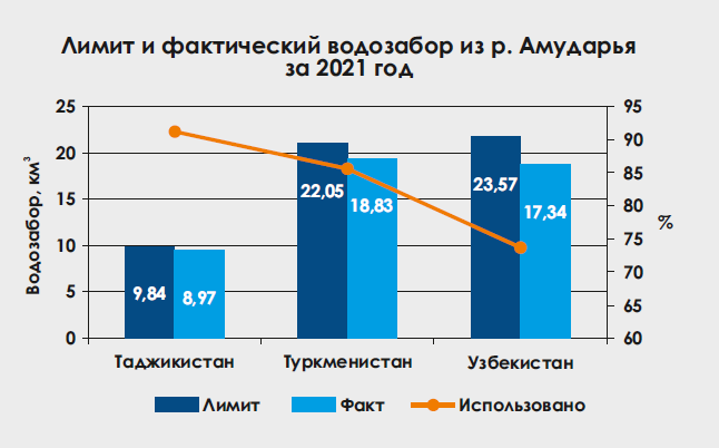 За 2021 г. из бассейна р. Амударья при установленном лимите водозабора в объёме 55,45 км3 фактически забрано 45,14 км3, в т.ч. за вегетацию – 31,38 км3. Годовой лимит использован на 81%, за вегетацию - 79% от назначенного лимита на водозабор в каналы равного 39,67 км3. По государствам: