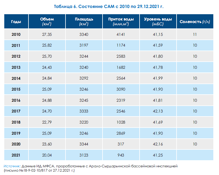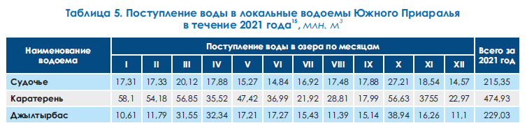 Согласно исследованиям НИЦ МКВК, по р. Амударья в Южное Приаралье в средние и выше по водности годы должно подаваться 8 км3, в маловодные - 3,5 км3. Фактически в 2021 г. в Южное Приаралье было подано 1,6 км3 или 20% от 8 км3.