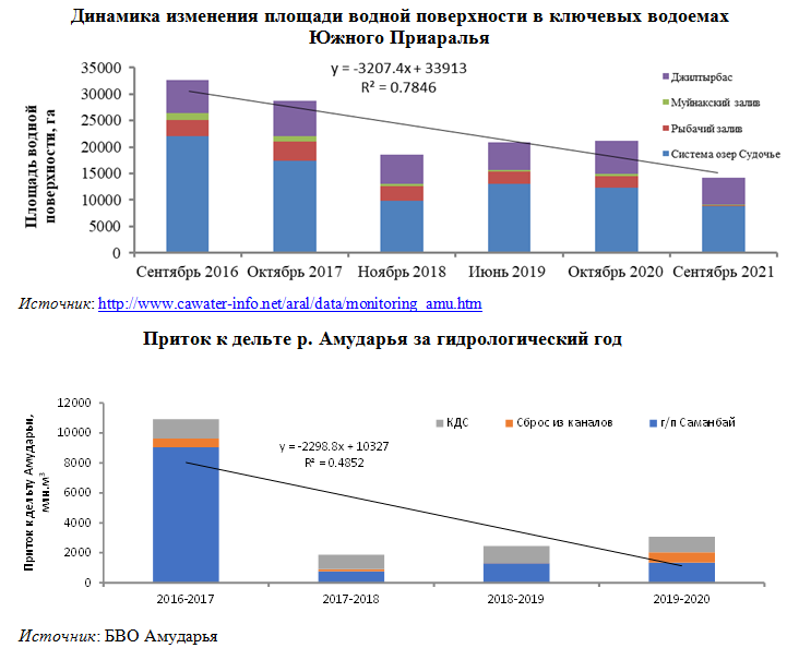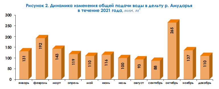 Анализ водохозяйственной ситуации в бассейне р. Амударья (по данным БВО Амударья) показывает, что в 2021 г. в дельту фактически поступило 1604 млн. м3 воды (сток реки, сбросы из каналов, коллекторов и др.) , что на 1089 млн. м3 меньше по сравнению с 2020 г.