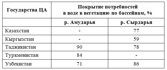 Удовлетворение потребностей в воде в вегетацию по государствам ЦА отражено в таблице ниже.