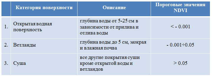 До 2022 г. общая площадь водоема определялась как сумма площади открытой водной поверхности и площади ветландов. Однако открытым оставался вопрос точного определения площади ветландов с тем, чтобы разграничить ее от суши (сухие, деградированные земли). Поэтому с 2022 г. начато использование индекса NDVI с уточненными пороговыми значениями, которые позволяют распознавать три категории поверхности: 1) открытая водная поверхность, 2) ветланды, 3) суша. Их описания и пороговые значения по индексу NDVI приведены в таблице ниже. В целях дальнейшей классификаций водных объектов на основе результатов исследования были выбраны пороговые значения NDVI: < -0.001 для открытой воды, -0.001...0.05 для ветланда и > 0.05 для других покрытий земной поверхности.