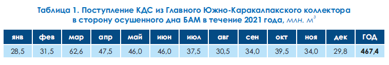 В обход дельты р. Амударья в сторону осушенного дна БАМ из Главного Южно-Каракалпакского (Правобережного) коллектора (ГЮКК) поступил коллекторно-дренажный сток в объеме 467,35 млн. м3 (таблица 1) , что почти на 100 млн. м3 больше, чем в 2020 г. (369 млн. м3).