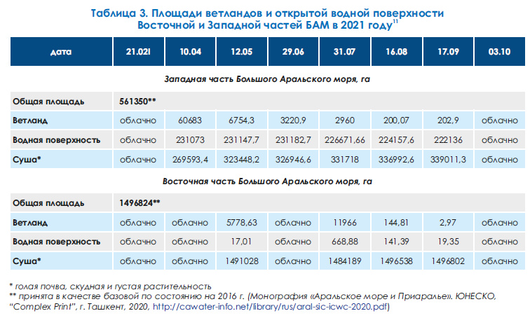 Динамика изменения площадей водной поверхности и ветландов БАМ и Южного Приаралья в 2021 г. свидетельствует о сложной гидрологической ситуации из–за изменчивости водности года. Площадь водной поверхности водоемов нестабильна. Требуются более целенаправленные мероприятия для устойчивого обеспечения необходимого количества воды для удовлетворения экологических потребностей Приаралья и Арала. Среди необходимых мер, в частности: завершение строительства дельтового комплекса р. Амударья с Междуреченским водохранилищем и системой озер по использованию КДВ Озерного коллектора; повышение эффективности деятельности БВО «Амударья» и бассейновых управлений в низовьях рек; исследование уровенного режима озерных систем; внедрение системы комплексного мониторинга Приаралья и Аральского моря с применением данных космических наблюдений.