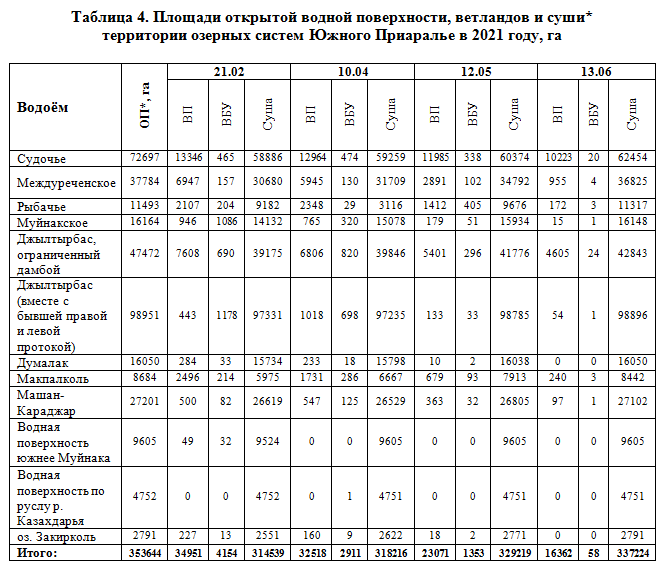 Озерные системы дельты р. Амударья представляют собой малые локальные водоемы Южного Приаралья. В целом в 2021 г. по сравнению с 2020 г. гидрологическая обстановка ухудшилась. Фактические площади акватории озерных систем составляют от 10 (февраль) до 2,5% (октябрь) проектной площади (353 644 га) . Площадь открытой водной поверхности озерных систем с февраля по октябрь уменьшилась с 34,9 до 8,1 тыс. га, ветландов - с 4,1 до 0,049 тыс. га (таблица 4). Подача 1604 млн. м3 воды в дельту р. Амударья не обеспечивает необходимые условия для рыболовства и поддержания экосистемы в водоемах: Судочье, Рыбачье, Муйнакское и Джылтырбас. Причиной является отсутствие плана наполнения водоемов дельты и управления процессом.