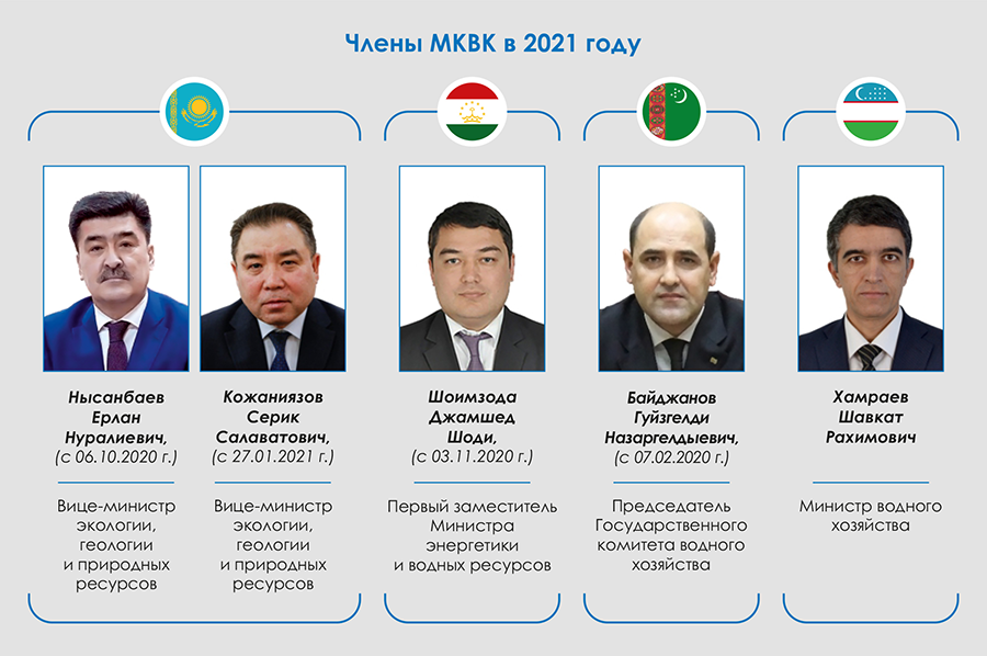 В 2021 г. проведены в режиме видеоконференции два заседания МКВК: 80-е заседание под председательством Таджикистана 11 мая и 81-е под председательством Узбекистана 7 декабря. На заседаниях присутствовали члены МКВК от Казахстана, Таджикистана, Туркменистана и Узбекистана (представители Кыргызстана, начиная с 68-го заседания, не принимают участие в деятельности МФСА), исполнительные органы (НИЦ МКВК, Секретариат МКВК, БВО «Амударья», БВО «Сырдарья») и приглашенные лица.
