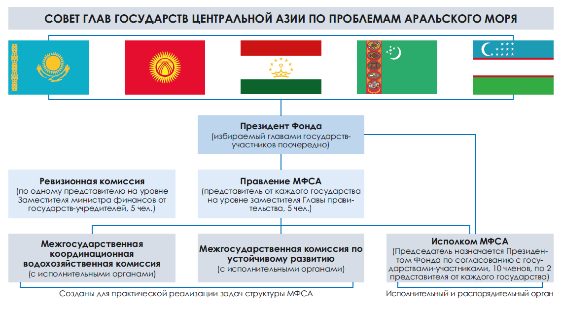 Международный Фонд спасения Арала (МФСА) создан решением Глав Государств ЦА 4 января 1993 г. с целью разработки и финансирования экологических и научно-практических проектов и программ, направленных на экологическое оздоровление районов, подвергшихся влиянию Аральской катастрофы, и решение социально-экономических проблем региона. Организационная структура МФСА представлена на схеме ниже.