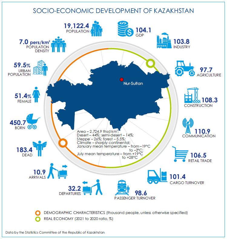 Water infrastructure. 60% of 3,298 irrigation networks extending to about 20 thousand km is in poor condition. Reconstruction of this poor network is performed on regular basis. Over 2019-2020, 1,734 km of canals were repaired and 111.5 thousand ha of irrigated land were put into use, while in 2021, these were 1,050 km of canals and 78 thousand ha of irrigated land, respectively. Reconstruction and repair of 42-Mm3 Kyzylgash reservoir, re-conservation of 2-MW Nurly-Shyrak HPP, and construction of the Kensai-Koskorgan-2 reservoir in Turkestan province were completed.
