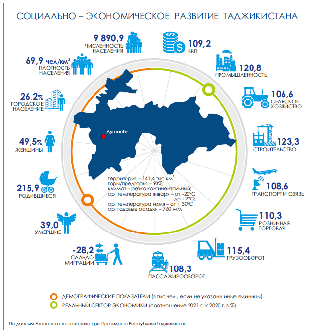 Валовой внутренний продукт (ВВП) на душу населения по итогам 2021 г. составил чуть более 10 тыс. 52 сомони ($890). Объем ВВП - более 98,9 млрд. сомони (более $8,7 млрд.).