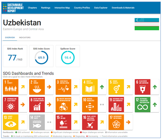 In October 2018, the Uzbek Government passed a resolution adopting 16 national SDGs. The State Statistics Committee collects and publishes the data on national SDGs on http://nsdg.stat.uz. Uzbekistan ranked 77 of 163 countries in the annual ranking of sustainable development (https://dashboards.sdgindex.org/rankings).