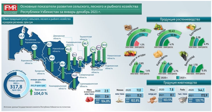 По итогам 2021 г. посевная площадь сельскохозяйственных культур составила 3260,7 тыс.га. Продукция сельского хозяйства составила 302524,9 млрд.сум, в т.ч. растениеводства – 151 083,4 млрд.сум, животноводства – 151 441,5 млрд.сум. Темпы роста производства продукции сельского хозяйства, во всех категориях хозяйств, в растениеводстве составили 103,1%, в животноводстве – 104,1%.