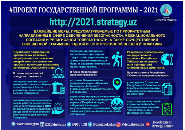 Регион Приаралья. Постановлением №ПП-2731 от 18.01.2017 г. утверждена Государственная программа по развитию региона Приаралья на 2017-2021 гг. В 2020 г. создан Комитет по вопросам развития региона Приаралья и экологии. В 2021 г. на заседаниях Комитета рассмотрены экологические вопросы, вопросы развития региона Приаралья и улучшения условий жизни населения (4 марта, 20 апреля, 24 мая, 22 июня, 28 июля, 11 ноября). Ведётся активная деятельность по реализации проектов, направленных на превращение зоны экологического кризиса в зону социально-экономического развития. В частности, в Тахтакупирском районе Каракалпакстана установлено оборудование по очистке и опреснению воды стоимостью в $1,1 млн. Комитет ведет переговоры с ЮНЕСКО по внесению каракалпакских юрт в Репрезентативный список нематериального культурного наследия ЮНЕСКО, что станет важным шагом в деле развития туризма и повышения доходов населения в регионе Приаралья.