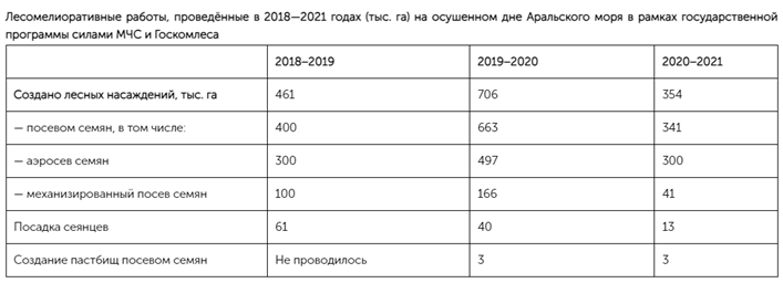 Реализация стратегий и программ. В рамках Государственной программы по развитию региона Приаралья на 2017-2021 гг. (Постановление №ПП-2731 от 18.01.2017 г.) МЧС РУз и Госкомлес РУз проводят лесомелиоративные работы: на осушенном дне Арала в целях предотвращения выноса вредоносных солей в атмосферу создаются лесные насаждения из пустынных растений.