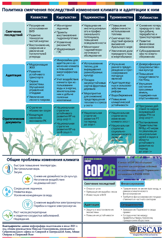 Все пять стран ЦА ратифицировали Парижское соглашение и представили свои первые ОНУВ. В инфографике обобщены планы по смягчению последствий изменения климата и адаптации к ним в странах ЦА, а также политические рамки, определяющие эти планы и стратегии. Для достижения поставленных целей по сокращению выбросов странам ЦА необходимо повысить энергоэффективность и интегрировать стратегии «зеленой» экономики, особенно в сельском хозяйстве и производственных процессах.