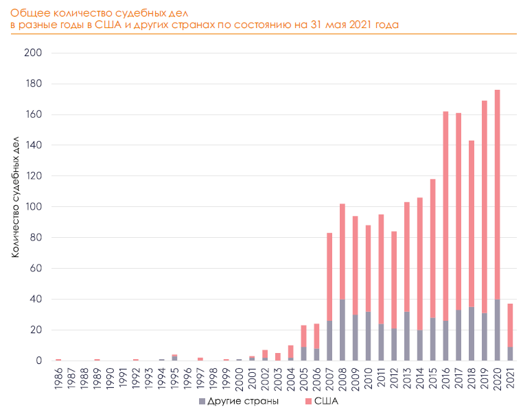 Глобальные тенденции в судебных разбирательствах по вопросам изменения климата в 2021 г. По состоянию на 31 мая 2021 г. в мире зарегистрировано 1841 судебное дело об изменении климата (см. рисунок ниже), в т. ч. 1387 исков поданы в суды США, а остальные 454 иска – в 39 странах, 13 международных или региональных судах и трибуналах (включая суды ЕС). За пределами США наибольшее количество судебных дел зарегистрировано в Австралии (115), Великобритании (73) и ЕС (58). С 2015 г. – года заключения Парижского соглашения и знакового дела «Фонд “Ургенда” против Нидерландов» - было подано 1006 исков, в то время как 834 дела были поданы в период с 1986 по 2014 гг.