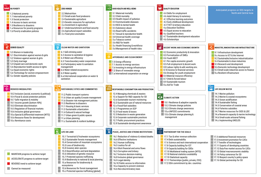 In this Subsection we present an overview of SDGs progress based on the ESCAP “Asia and the Pacific SDG Progress Report 2022. Widening disparities amid COVID-19”. This Report provides an analysis of progress on 17 SDGs and 169 targets in the region and in each of the five subregions, including Central Asia. The report also provides an analysis of data gaps that prevent the monitoring of progress, and it provides an investigation of sources and priority areas for enhancing SDG data availability.