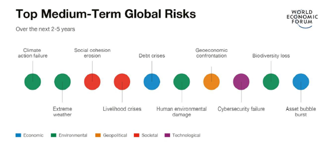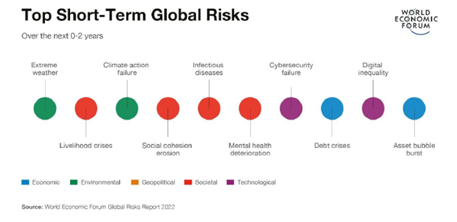 According to the WEF’s Global Risks Report 2022, the main risks on a global scale are related to climate threats. “Climate action failure”, “extreme weather”, and “biodiversity loss” will be the most severe risks over the next 10 years. Technological risks—such as “digital inequality” and “cybersecurity failure”—are other critical short- and medium-term threats to the world. “Social cohesion erosion”, “livelihood crises” and “mental health deterioration” are also included in the group of short-term risks.