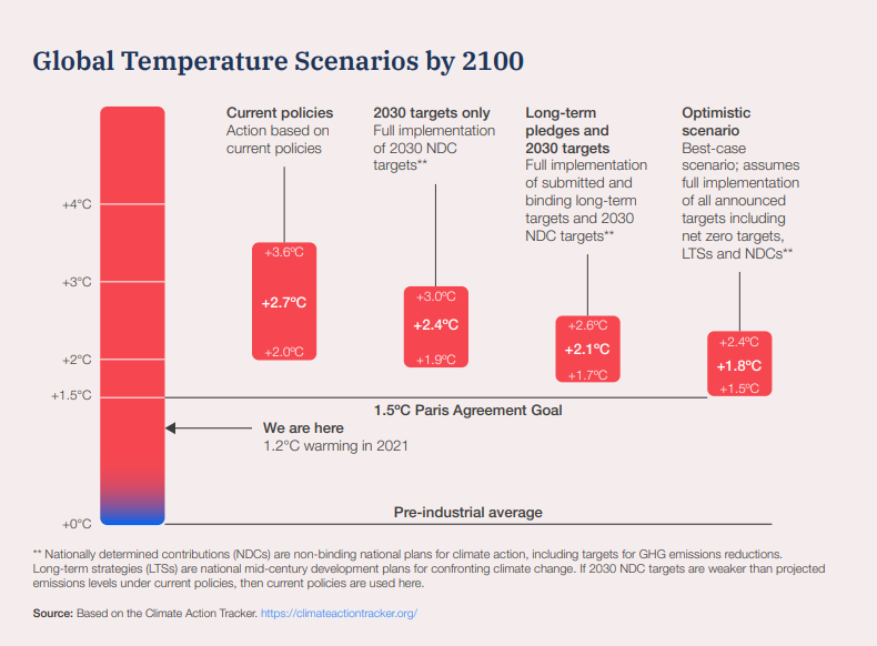 The latest nationally determined contributions (NDCs) to decarbonization made at the 2021 COP26 still fall short of the 1.5°C goal set out in the Paris Climate Agreement. The current trajectory is expected to steer the world towards a 2.4°C warming, with only the most optimistic of scenarios holding it to 1.8°C.