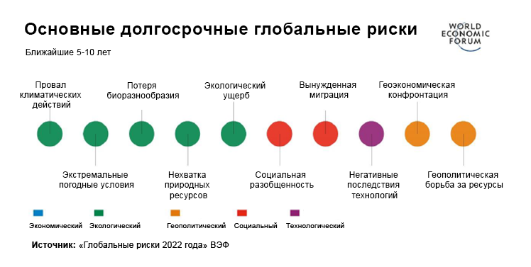 Согласно отчету «Global Risks Report 2022» Всемирного экономического форума (ВЭФ), основные риски планетарного масштаба связаны с климатическими угрозами. В следующие 10 лет наибольшую опасность будут представлять экстремальные погодные условия, потеря биоразнообразия и дефицит политической и экономической воли в области борьбы с изменением климата. В числе существенных краткосрочных и среднесрочных угроз находятся технологические риски, включая «цифровое неравенство» и вопросы кибербезопасности. В группу рисков краткосрочного характера включены также растущее социальное неравенство, падение доходов и значительное ухудшение ситуации с психическим здоровьем.