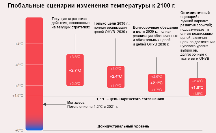 Определяемые на национальном уровне вклады (ОНУВ) по снижению выбросов углекислого газа, представленные на СОР26 в 2021 г., не позволяют достичь цели Парижского соглашения по ограничению роста температуры до 1,5°C - их полная реализация приведет к потеплению на 2,4°C. По самым оптимистичным сценариям рост температуры можно будет удержать на уровне 1,8°C.