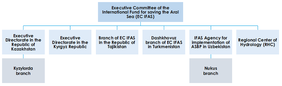 The International Fund for Saving the Aral Sea (IFAS) was established by a decision of the Heads of CA states on the 4th of January 1993 with the aim of developing and funding environmental and applied research projects and programs in order to improve ecological situation in the areas affected by the Aral Sea catastrophe and address the socioeconomic issues in the region. The organizational setup of IFAS is shown below.