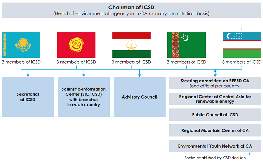 The Interstate Commission on Sustainable Development (ICSD) was established by the decision of the Interstate Council for the Aral Sea Basin in 1993. It is entrusted with the mission of coordination and management of regional cooperation in the field of environmental protection and sustainable development of the CA states. The organizational setup of ICSD and location of its executive bodies are shown in the figures below.