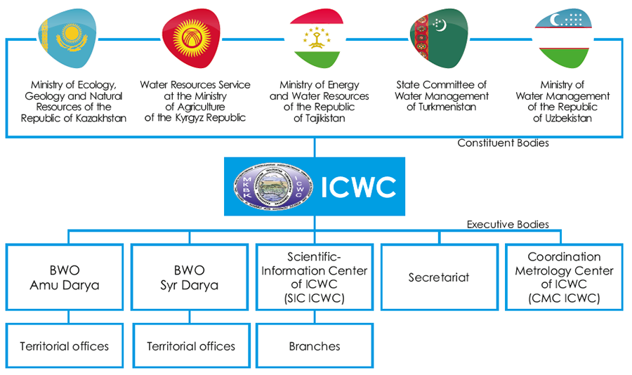 The Interstate Commission for Water Coordination in Central Asia (ICWC) is a regional body of the CA states that deals with the issues related to control, efficient use and protection of water in the interstate sources of the Aral Sea basin and implements the jointly developed programs on the basis of cooperation and mutual respect for the parties' interests. The Commission was formed on February 18, 1992. The organizational set-up of ICWC is shown in the diagram below.