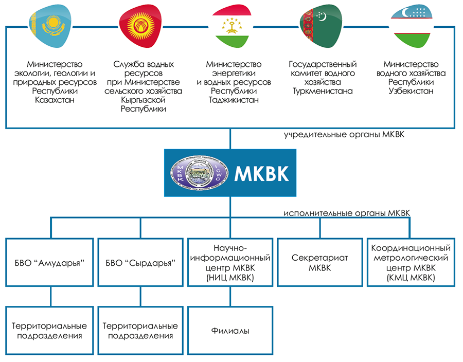 Межгосударственная координационная водохозяйственная комиссия Центральной Азии – региональный орган государств ЦА по совместному решению вопросов управления, рационального использования и охраны водных ресурсов межгосударственных источников в бассейне Аральского моря и реализации совместно намеченных программ на основе принципов коллегиальности и взаимного уважения интересов сторон. Создана 18 февраля 1992 г. Организационная структура МКВК представлена на схеме ниже.