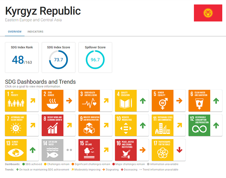 According to the National Development Strategy of the Kyrgyz Republic for 2018-2040 , the country will strive to achieve the adopted SDGs by 2030. Kyrgyzstan was ranked 48 among 163 countries in the annual sustainable development rating.