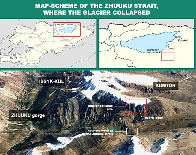 Natural disasters. The glacier collapse occurred in the mountains of Issyk-Kul province on the Zhuuku strait at the Terskey Ala-Too ridge. The estimated melted glacial mass is more than 2 million m3 (July 8).