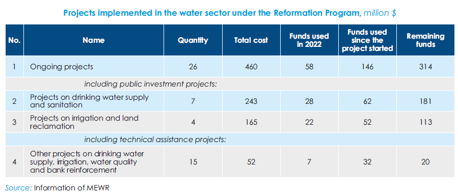 In the land reclamation and irrigation (+bank reinforcement) sphere, 4 projects are currently underway. The total cost is $165 million of which about 80% is allocated for infrastructure rehabilitation and construction. In 2022, $22 million were used.