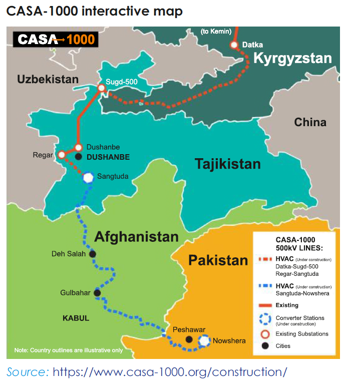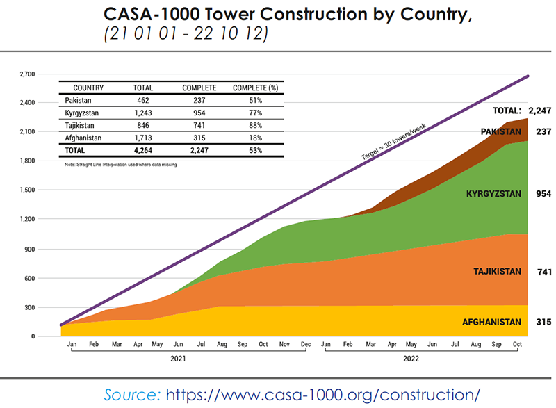 Construction at the Sangtuda converter substation is over 98% complete, while general construction is 90% complete. The installation of major electrical components is underway, and all seven main converter transformers were assembled. The following interventions are in progress: (1) construction work to upgrade two substation sites along the CASA-1000 route (Sughd-500 and Regar-500); (2) construction of transmission towers along the entire length of the CASA-1000 system in the country, while construction of the HVDC line from Sangtuda to the Afghan border is fully completed.