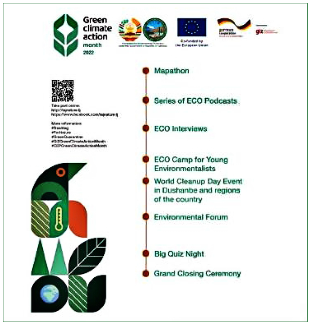 Events. As part of the Green Climate Action month (August 21-September 17), the following events were held: eco-podcast series “Listen Green”, training “Joint mapping in Tajikistan” (August 23, Dushanbe), roundtable “Potential for development of cross-border cooperation in protected natural areas between the Republic of Tajikistan and the Republic of Uzbekistan” (August 31, Dushanbe), “Clean environment is a guarantee of human health” campaign (September 3, Dushanbe).