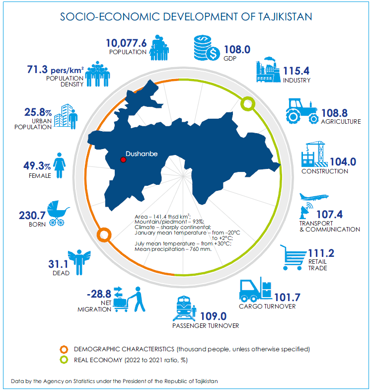 Gross Domestic Product (GDP) amounted to 115.7 billion TJS (over $11.3 billion), which is 8% more than in 2021. The inflation rate was 4.2%, which is 3.8% less than in the last year.