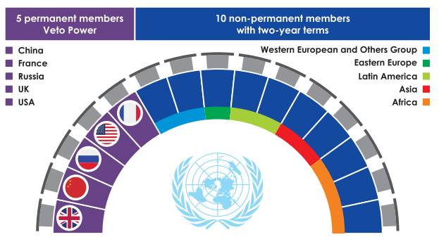 The Security Council (SC) has primarily responsibility for the maintenance of international peace and security; all UN members are obliged to follow its decisions. It has 15 members, including 5 permanent members with veto power (Great Britain, China, Russia, USA, France) and 10 non-permanent, elected by the UNGA for two-year terms of five countries each year.