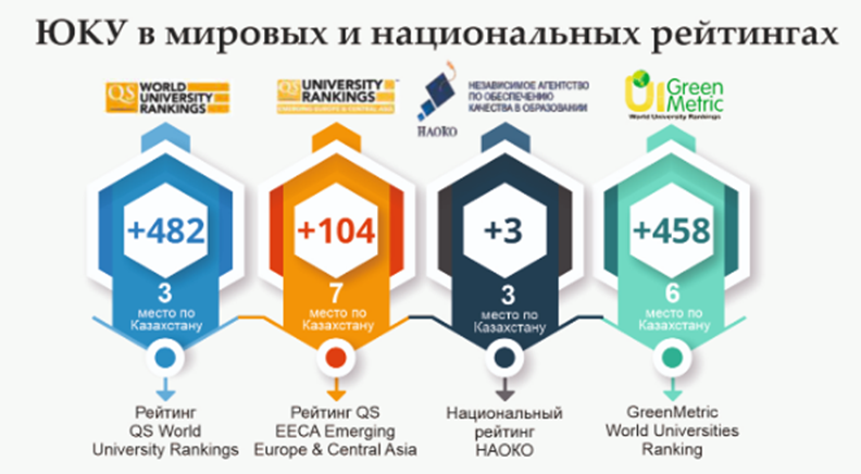 Достижения и награды. ЮКГУ им. М.Ауэзова итогам международных рейтингов (1) «Лучшие университеты мира» 2023/ QS World University Rankings (QS WUR 2023) занял 481 место среди 1500 вузов; (2) «Лучшие университеты Азиатского региона» / QS Asia Ranking 2023 - 177 место среди 757 вузов; (3) UI GreenMetric - 260 место среди 1050 вузов.
