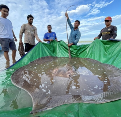 The 4-meter-long giant freshwater stingray (Urogymnus polylepis) captured accidentally