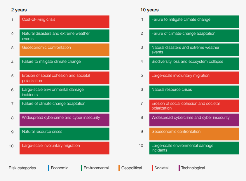 Risks map. Half in the top 10 risks over the next two years are environment-related risks from natural disasters and natural resource crises to failure to mitigate climate change and failure of climate-change adaptation. Another three risks are viewed as social ones – besides the cost-of-living crisis, these are the risks of societal polarization and large-scale involuntary migration.