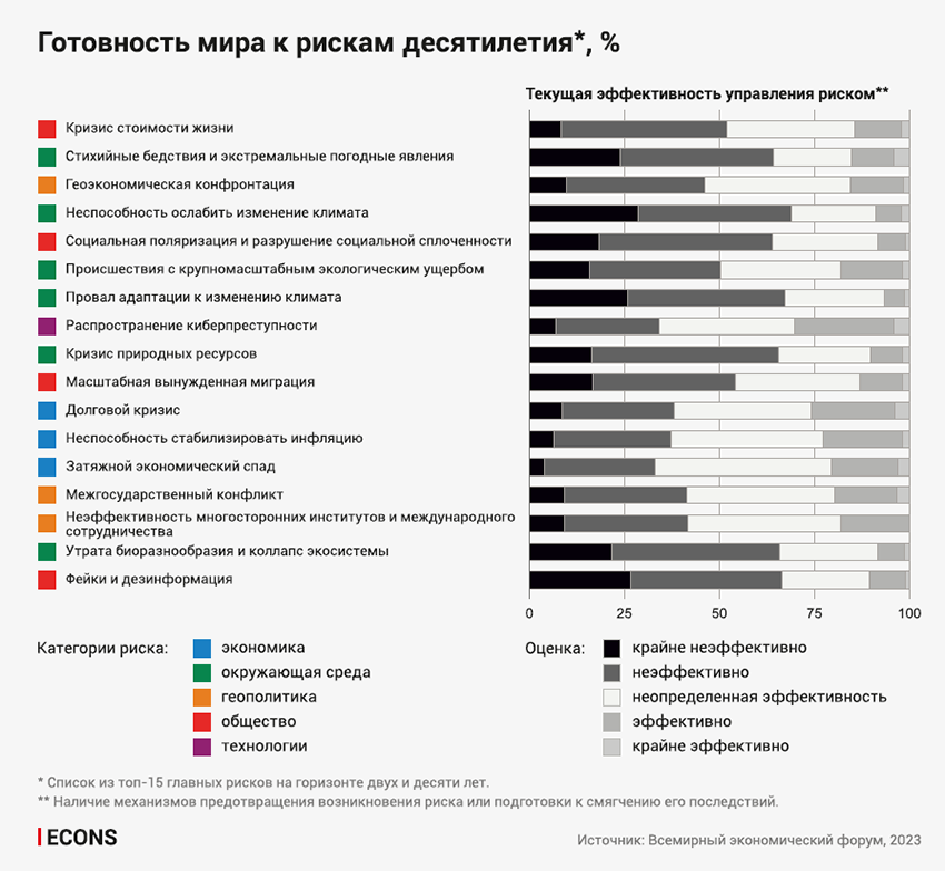 It is characteristic that environmental risks account for half in top 10 short-term risks and take six positions, including first four rankings in top 10 risks over the next decade. Counteractions on global warming has stagnated: the combination of current economic, societal and geopolitical crises diverts attention and resources from the long-term risks and, eventually, the world may face the rising burden on natural and human ecosystems.