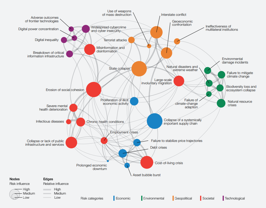 The world has faced a set of risks that feel both wholly new and eerily familiar. First, it is a return of “older” risks – inflation, cost-of-living crises, trade wars, widespread social unrest, geopolitical confrontation and the spectre of nuclear warfare. Second, these are being amplified by comparatively new developments in the global risks landscape, including unsustainable levels of debt, a new era of low growth, low global investment and de-globalization, a decline in human development after decades of progress, rapid and unconstrained development of dual-use (civilian and military) technologies, and the growing pressure of climate change impacts and ambitions in an evershrinking window for mitigation.