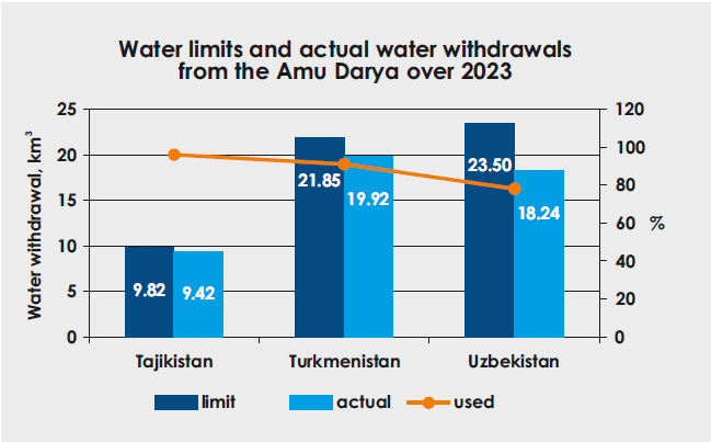• Uzbekistan: limit - 23.5 km3; actual withdrawal - 18.24 km3