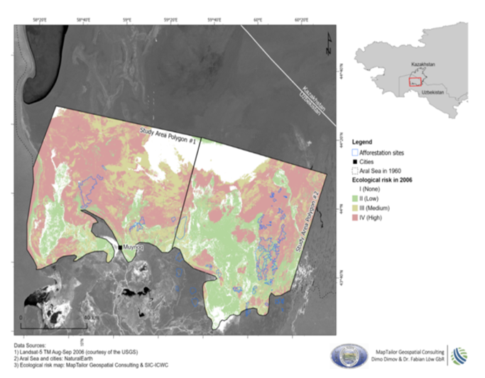 Recommendations: (1) implement measures to combat diseases and pests affecting desert forests; (2) establish two research stations for laboratory research and ecological risk assessment on the dried Aral Sea bed; (3) identify suitable areas for sowing seeds of halophyte and xerophyte plants based on comprehensive surveys.