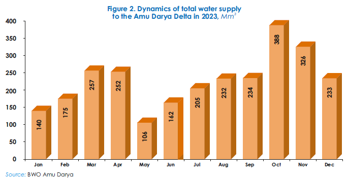 According to BWO Amu Darya, in 2023, 2,710 Mm3 of water (including river flow and water discharged from canals and collecting drains) reached the Amu Darya delta. This is 655 Mm3 more than in 2022.