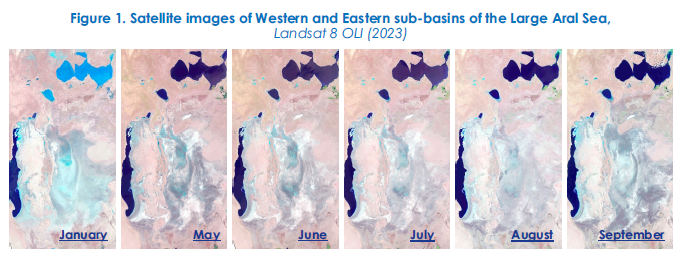 By the end of 2023, the Western sub-basin of the LAS experienced a slight decrease in water surface area, while wetland area increased significantly. In contrast, the Eastern sub-basin saw a considerable reduction in water surface area and a minor increase in wetland area. Small local lakes in the South Aral Region continue to face challenges due to unstable water supply.