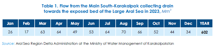 Bypassing the Amu Darya delta, 602 Mm3 of collector-drainage water flowed towards the exposed bed of the Large Aral Sea from the Main South-Karakalpak (Right-bank) collecting drain (Table 1). This is 98.5 Mm3 more than in 2022 (503.5 Mm3).