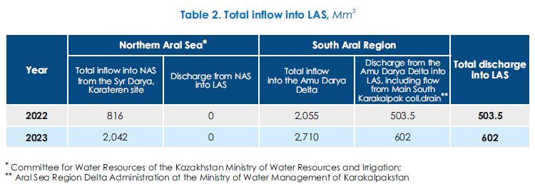 In 2023, the total inflow into the Large Aral Sea (LAS) increased from 503.5 Mm3 (2022) to 602.0 Mm3. The LAS got water from the Main South Karakalpak collecting drain (SKCD) only. No water was discharged from the Amu Darya River Delta and the Northern Aral Sea (NAS) (Table 2).