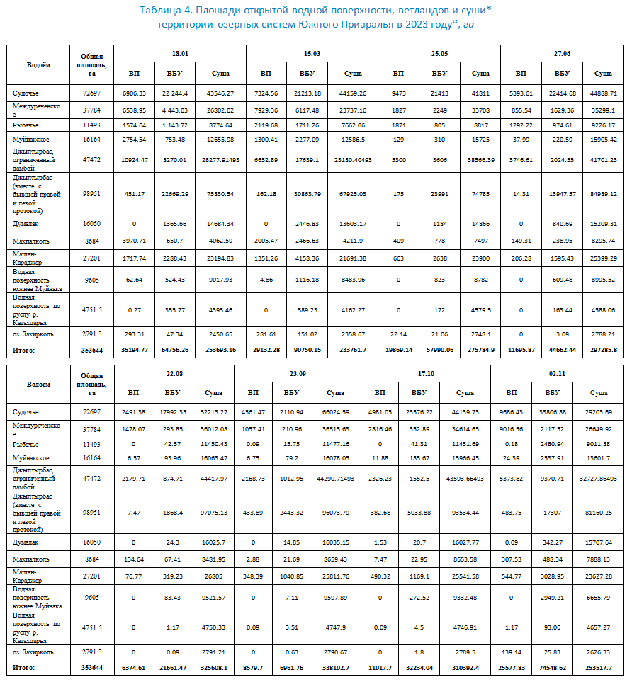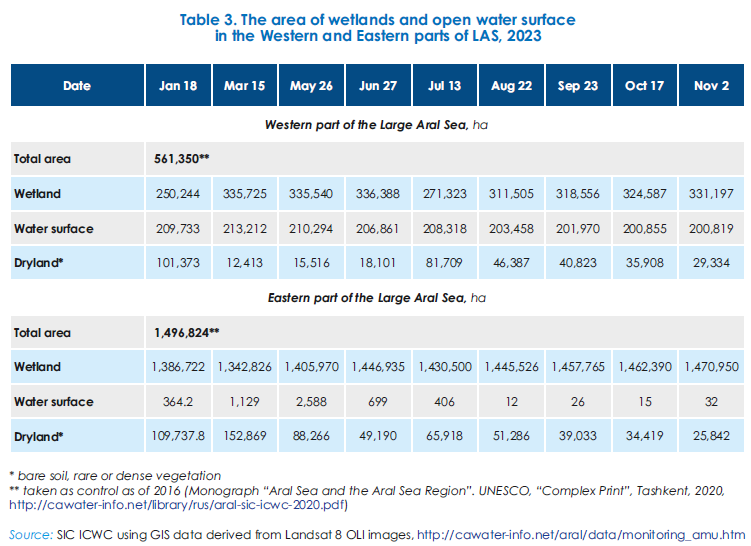 This section was prepared using data from the BWO Amu Darya, the Aral Sea Region Delta Authority, and the Uzbek Hydrometeorological Service (UzHydromet). The data was gathered also through remote sensing (RS) monitoring of the Eastern and Western sub-basins of the Large Aral Sea (LAS) and the lake systems in the Amu Darya River delta using Landsat 8 OLI images. Since 2022, refined threshold values have been used with NDVI for satellite imagery analysis to identify three surface categories: 1) open water surface, 2) wetland, and 3) dryland. Previously, the total water surface area was determined as the sum of open water surface and wetland areas. However, the challenge of distinguishing wetlands from dry, degraded land remained unsolved. The information for 2021 and 2022 has been updated using this improved methodology. Therefore, some discrepancies may be found when comparing this data with information from previous years.