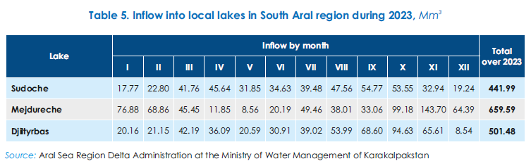 Small local water bodies in the South Aral region comprise the lake systems of the Amu Darya delta. The hydrological situation improved in 2023 compared to 2022. The open water surface area of the lake systems decreased from 35.1 to 25.5 thousand ha, while the wetland area increased from 64.7 to 74.5 thousand ha since January to November (Table 4). Delivering 2,710 Mm3 to the delta is insufficient for fisheries and ecosystem preservation in lakes Sudoche, Rybache, Muynak and Djiltirbas.