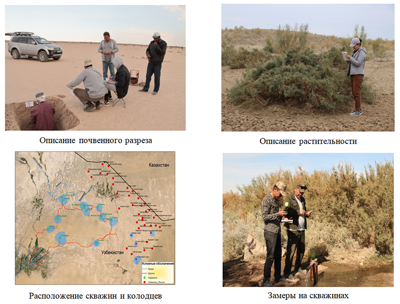 5. Remote sensing research. An innovative mapping method and strategy have been developed to interpret and map the landscapes of the exposed Aral Sea bed. Over 2,800 field samples were collected, documenting coordinates, vegetation types, dominant species, plant layers, soil morphology, and other relevant data. By combining desk studies in ArcGIS 10.8 with the analysis of Landsat 8 OLI images and field observations on geobotany, environment, and soil, maps of ecological hazard were generated, and trends were assessed. Expedition findings indicate that self-overgrowing processes have led to vegetation covering approximately 10% of the exposed seabed.