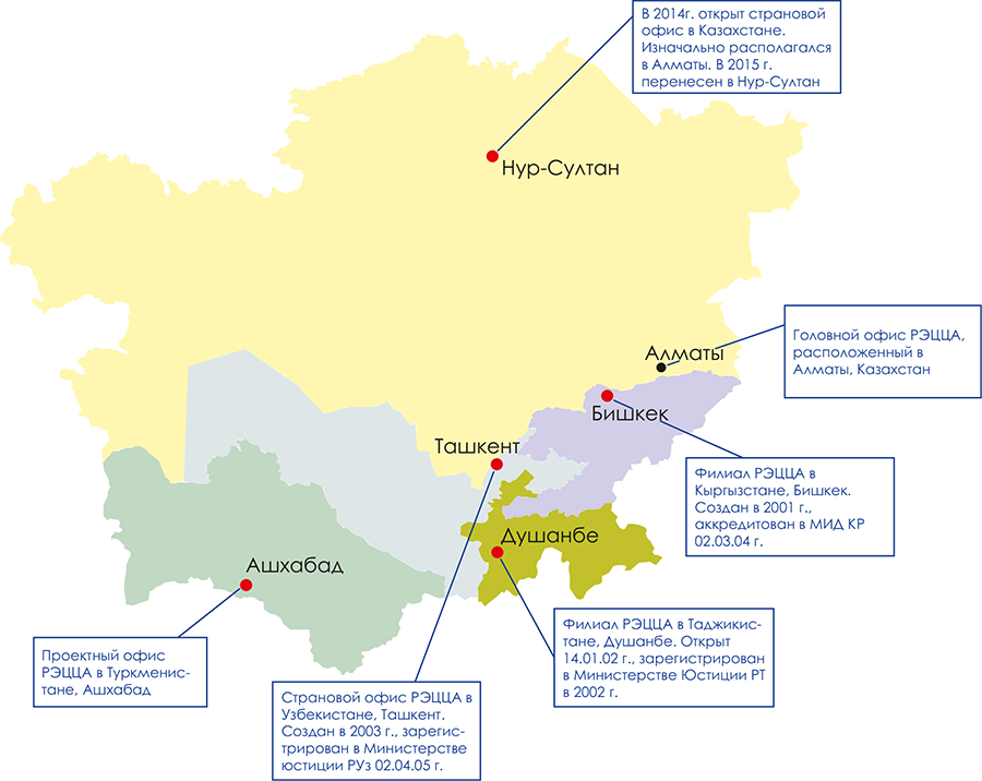 РЭЦЦА является независимой, некоммерческой, неполитической международной организацией, оказывающей содействие правительствам стран ЦА, региональным и международным заинтересованным сторонам и партнерам в решении проблем окружающей среды и устойчивого развития в ЦА. Головной офис расположен в Алматы, страновые офисы действуют в 5 государствах ЦА.